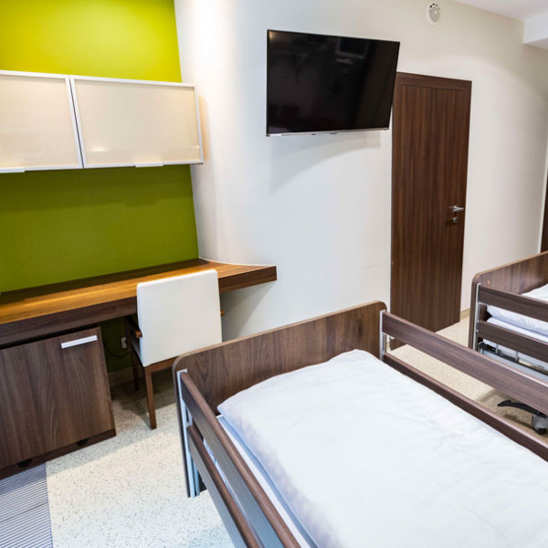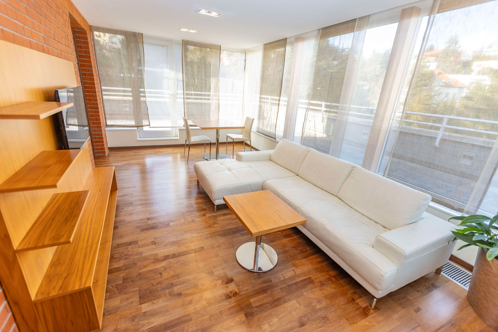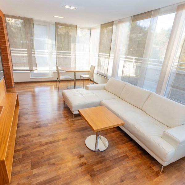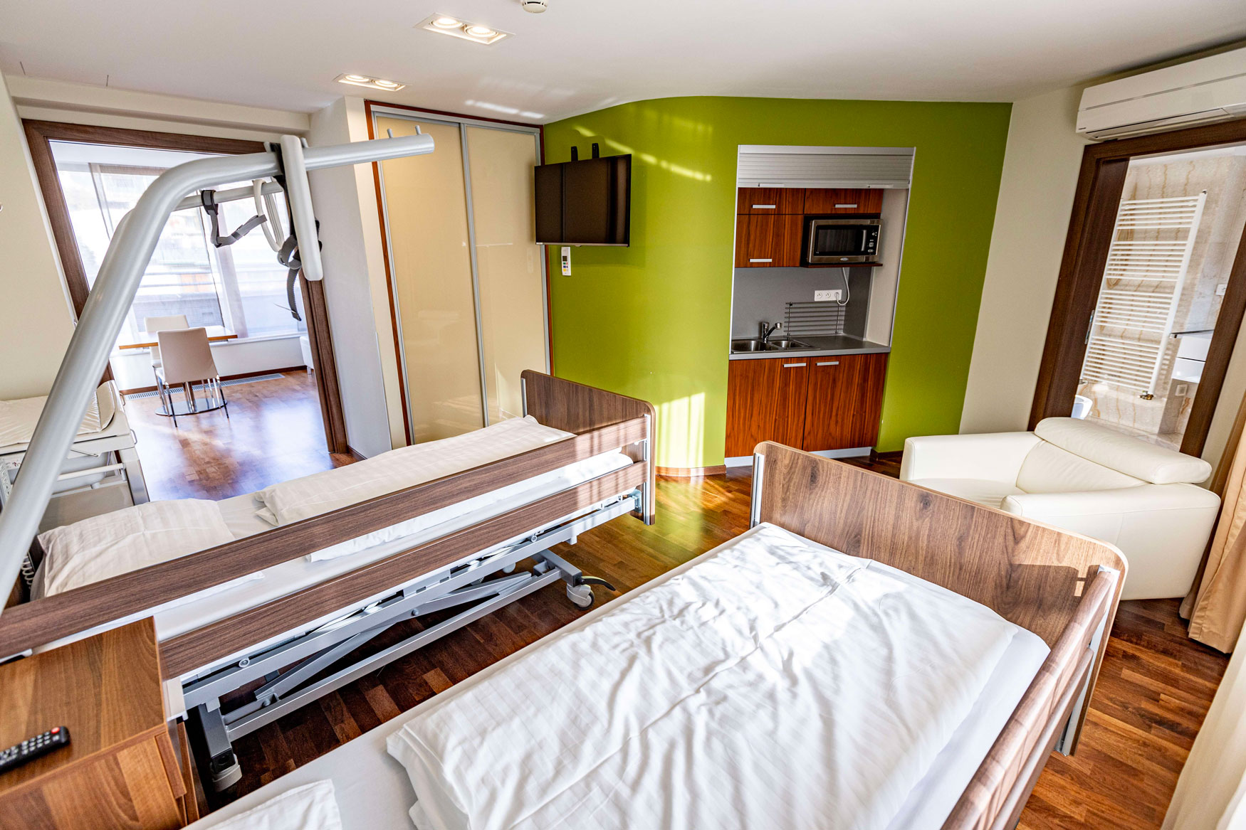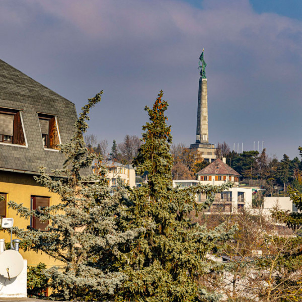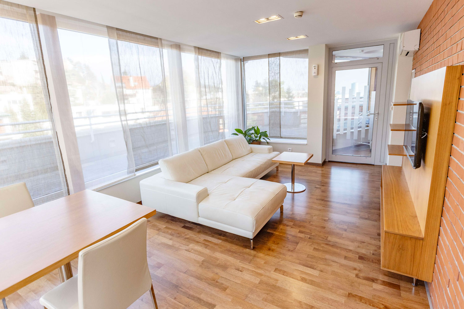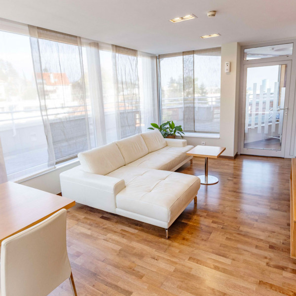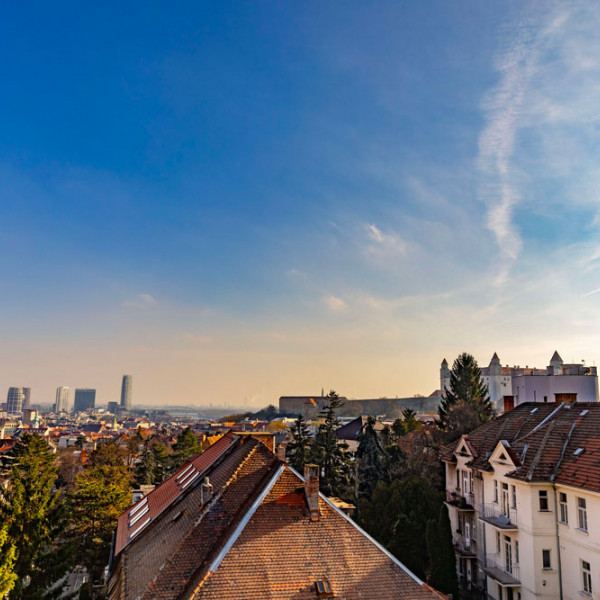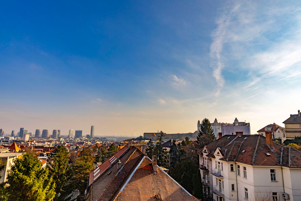 Nadštandartné ubytovanie k dispozícii v pôrodnom balíčku KOCH Premium. Priestranný apartmán s úžasným výhľadom do Kochovej záhrady i na panorámu Bratislavy.